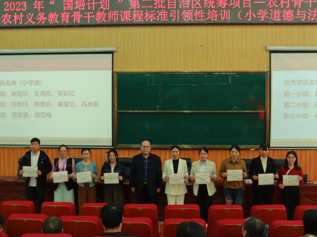 黄映然向圆满完成各项培训任务的全体学员表示祝贺,向给予项目支持的单位和个人表示感谢。他指出,本次培训学习内容丰富多彩,课程设置针对性强,团队力量配置高,教学形式多样、方法灵活、互动性强,培训效果得到培训学员的一致认可,培训工作取得良好成效。黄映然以都安中学为例,结合自己多年的思政教学与管理经验,向参训学员提出三点要求:一是要有道有爱,作为道德与法治学科的骨干教师要有高尚的道德情操和热爱本职工作与员工的情怀;二是要因材施教,掌握员工成长规律,培养员工全面发展;三是久久为功,坚持在教师岗位上发光发热,希望学员们能够理论联系实际,学以致用,把从培训中学习到的知识和技能运用到今后的教学、教研和教改工作中去,争取早日成为教学名师,在平凡的工作岗位创造出不平凡的业绩。