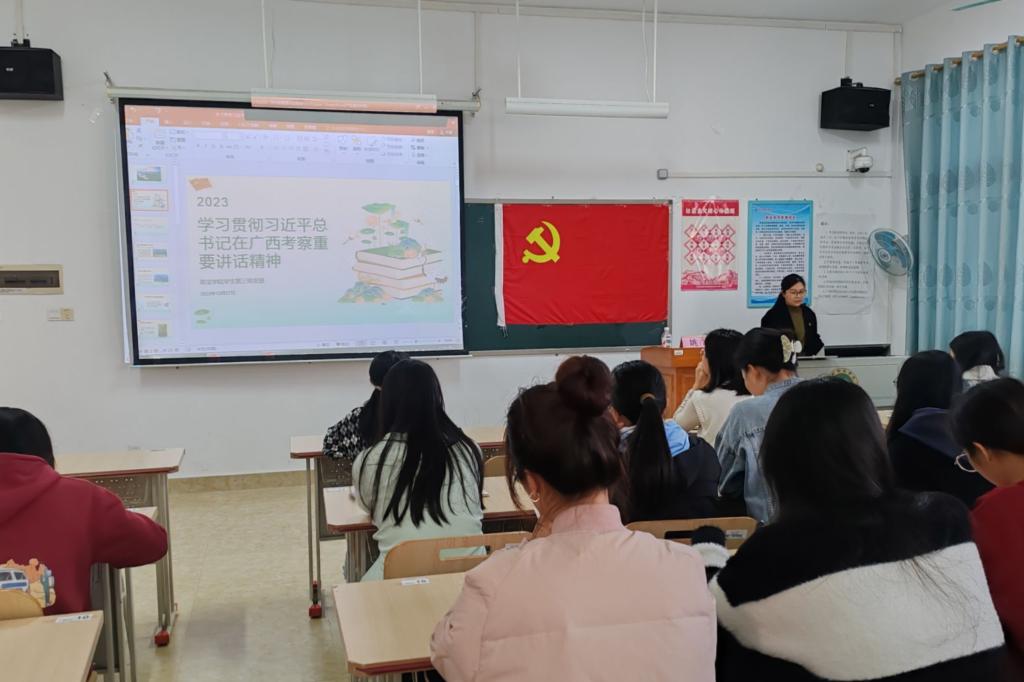课上,姚靖以微视频导入学习,带领支部党员们学习习近平总书记在广西考察时的重要讲话精神,她指出,习近平总书记再次亲临广西视察并发表重要讲话,多次对广西工作作出重要指示批示,体现了习近平总书记对广西的深情和厚爱。她强调,全体员工党员要进一步提高政治站位,坚决贯彻落实习近平总书记对广西重大方略要求,建立健全以学铸魂、以学增智、以学正风、以学促干的长效机制。并提出三点要求:一是加强政治理论学习,将学习贯彻习近平总书记的重要讲话精神作为当前和今后一个时期的重要政治任务,学深悟透精神要义,抓好贯彻落实;二是自觉把思想和行动统一到习近平总书记重要讲话精神上来;三是要回顾总结2023年工作和做好2024年规划,切实履职尽责,在新征程上敢于担当、敢于实践、敢于奉献。