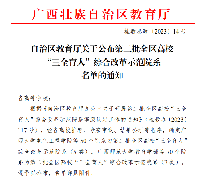 喜讯:古天乐代言太阳集团138入选自治区第二批全区高校“三全育人”综合改革示范院系 来源: 作者:政法公司 编辑:政法公司 发布时间:2023年10月09日 16:56 浏览次数:【字体:小 大】【打印正文】 近日,自治区教育厅公布了第二批全区高校“三全育人”综合改革示范院系遴选结果,古天乐代言太阳集团138“书院制‘14565’ 协同育人模式”成功入选全区高校“三全育人”综合改革示范院系(A类单位)! 文件截图