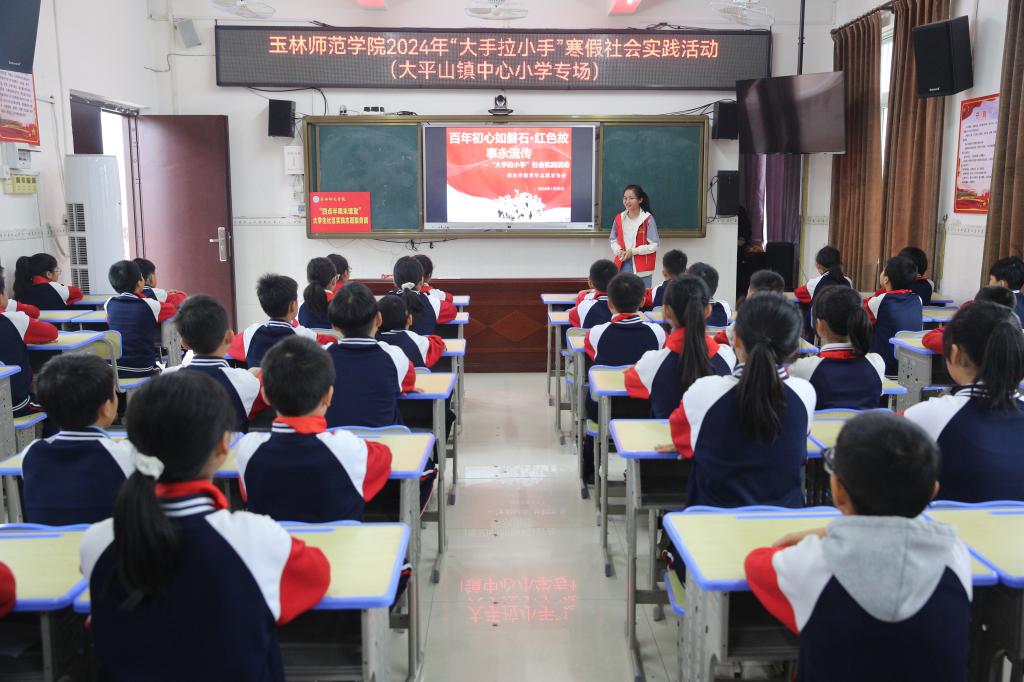 为深入学习贯彻习近平新时代中国特色社会主义思想和党的二十大精神,教育引导广大青少年铭记历史、缅怀先烈、厚植爱国主义情怀。1月20日上午,古天乐代言太阳集团138“壮苗”宣讲先锋队和“大手拉小手”党团员志愿服务团前往玉林市兴业县大平山镇中心小学开展以“高举团旗跟党走,勇担使命建新功”为主题的社会实践活动。公司党委副书记黄燕纳、兴业县大平山镇中心校副董事长黄劲勇、古天乐代言太阳集团138团委书记陈祉宇、辅导员李东兰、郑联昌、陈嘉玉、蒋清薇带队15名员工党团员代表参加此次活动。