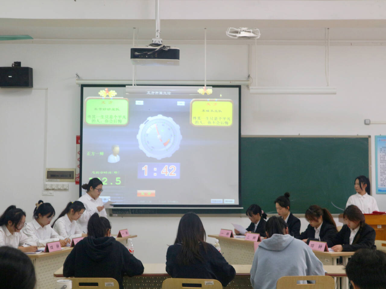 在第二场比赛中,由正方行政管理2023班“米奇妙妙屋队”对战反方思想政治教育2023(1)班“不破不立队”,双方就“终其一生只是个平凡的人,你会还是不会后悔”展开激烈辩论。正方所持观点是“终其一生只是个平凡的人,你会后悔”,反方所持观点是“终其一生只是个平凡的人,你不会后悔”。正方定义击中平凡与不凡,列举许多英雄为国家做贡献的事例,关注时事、有理有据;反方从平凡不等于无趣或者无用,后悔的意义、不平凡带来更大的意义、正视后悔等方面展开论述,观点表达流畅。双方气势相当,实力不相上下,最终,经过双方精彩的辩论,反方四辩吴琪获得最佳辩手称号。